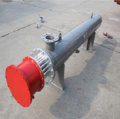 管道加熱器分為兩種模式:一種是采用管道加熱器內部的法蘭式管狀電熱元件倒插在管道加熱器中的反應釜夾套中加熱導熱油,將管道加熱器中的熱能傳輸給管道加熱器內部反應釜中的化工原料。