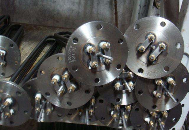 HRY1-護套式電加熱器(也稱插入式電加熱器):是采用U型管狀電熱元件,依據(jù)加熱不同介質設計規(guī)范,按照功率配置要求裝配在法蘭蓋上,插入需加熱物料中,發(fā)熱元件工作時所發(fā)出的大量熱量傳導給被加熱介質使介質溫度升高,達到所需的工藝要求。當介質溫度達到工藝要求的設定值時,控制系統(tǒng)根據(jù)溫度傳感器信號,經(jīng)PID運算后調節(jié)電加熱器輸出功率,對發(fā)熱元件的電阻性負載實現(xiàn)溫度控制。使介質溫度均勻,達到所需要求;當發(fā)熱元件超溫或低液位時,發(fā)熱元件的聯(lián)鎖保護裝置立即切斷加熱電源避免發(fā)熱元件燒壞,延長使用壽命。法蘭式電加熱器是由多支加熱管焊接在法蘭上集中加熱,主要用于敞開式、封閉式的溶液箱和循環(huán)系統(tǒng)中加熱用。