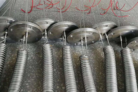 電加熱器由加熱芯子和護(hù)套管組成,加熱芯子用管狀電加熱元件為熱源,護(hù)套管采用薄型不銹鋼管制成,接線裝置保護(hù)采用螺栓式罩殼密封,防水、防潮、防油。